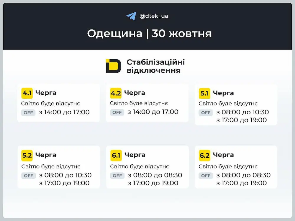 У ДТЕК Одеські мережі попереджають: у разі нових команд від Укренерго графіки оновлюються – будь ласка, переглядайте їх періодично.