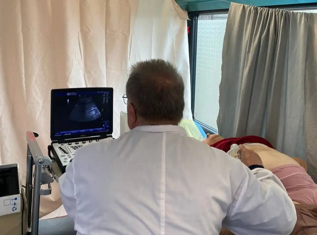 Лікар проводить УЗІ-діагностику в медичному автобусі