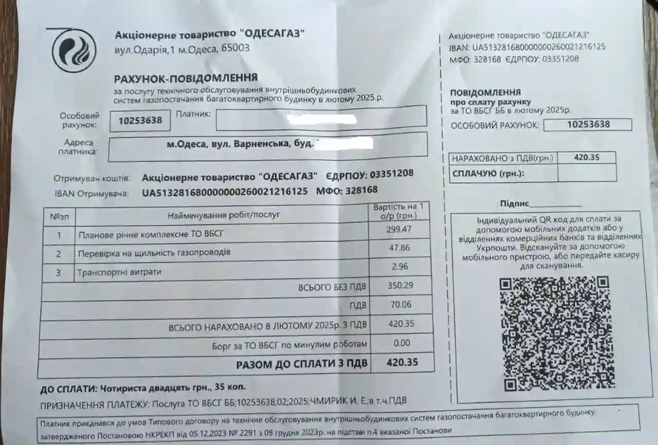 – Подзвонили у двері – представилися співробітниками компанії «Одесагаз». Повідомили, що оглядають внутрішньобудинкові мережі. Розпитали про скарги та почали труби перевіряти. Щось там робили: мазали, крутили, світили. Потім ще раз піднявся майстер, сказав, що виявили витік. Запитав, чи не відчували ми запах. Запах, до речі, був. Але не прямо газу – якоїсь вогкості. А ми не надали значення, тому що будинок ХІХ століття, і вогкість у парадній є. Майстер сказав, що це був запах газу, – ділиться дівчина. – Відключили газ десь на годину, переварили шматок труби на другому поверсі, все перевірили. Запустили газ. Принесли на підпис акт про виконані роботи. І вручили квитанцію за технічне обслуговування на 500 гривень. Сусідам платіжки залишили у дверях.