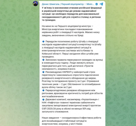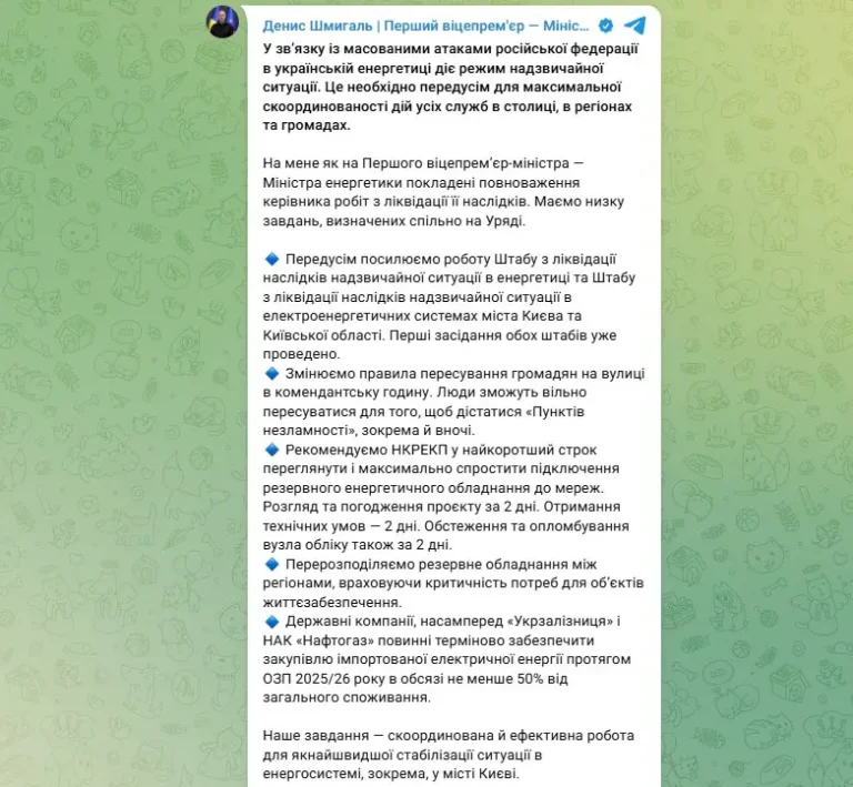 Крім цього, Шмигаль анонсував посилення діяльності Штабу з ліквідації наслідків надзвичайної ситуації в енергетиці та Штабу з ліквідації наслідків надзвичайної ситуації в електроенергетичних системах Києва й Київської області.