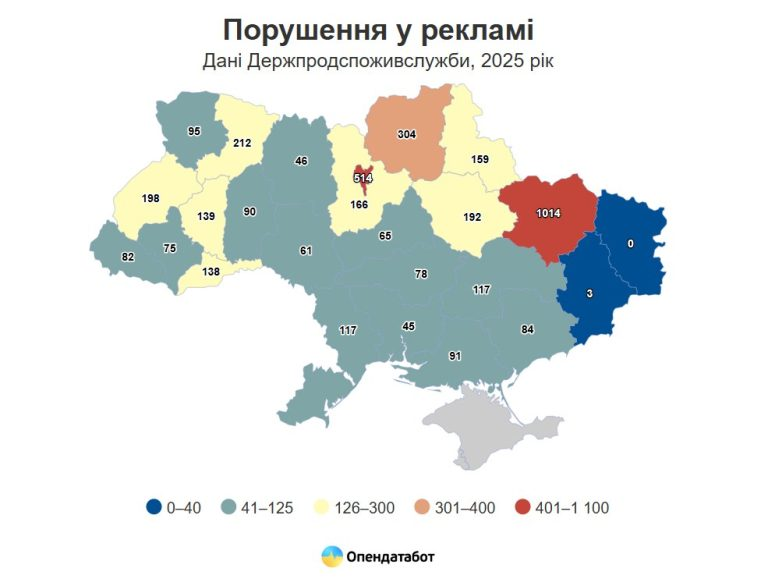 За даними сервісу“Опендатабот”, за 2025 рік кількість порушень у сфері реклами зросла в 1,5 раза. В Одеській області зареєстрували 117 таких випадків. До слова, це більше, ніж у Миколаївській (45) та Херсонській (91) областях. Щоправда, Одеса не потрапила до лідерів антирейтингу по країні за кількістю зауважень.
