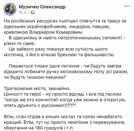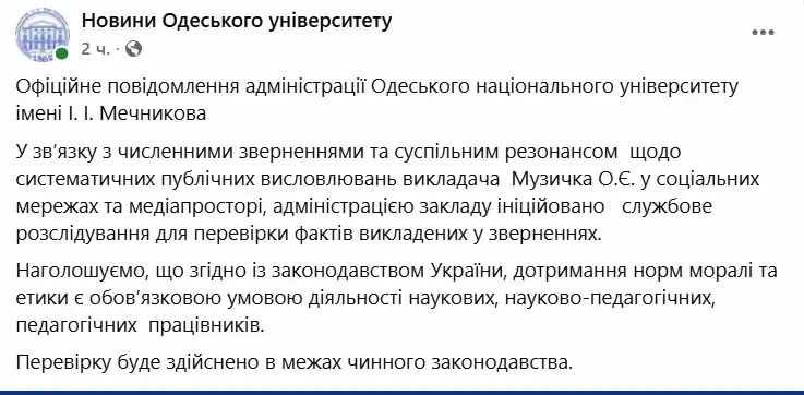 В Одеському національному університеті імені І. І. Мечникова розпочато службове розслідування щодо викладача Олександра Музичка. Причиною стали його публікації в соціальних мережах, пов’язані зі смертю актора Володимира Комарова.