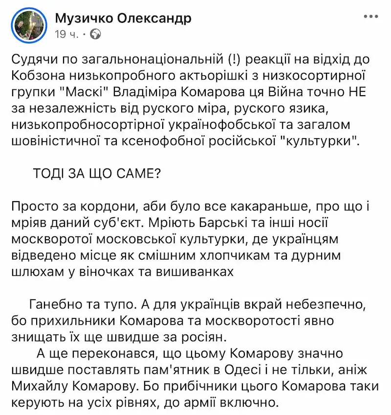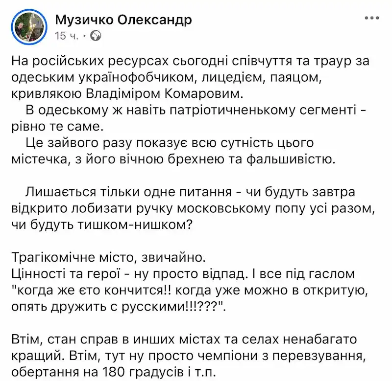 Одеський національний університет імені І. І. Мечникова розпочав офіційне службове розслідування щодо історика Олександра Музичка. Причиною стали його провокаційні публікації в соціальних мережах про смерть легендарного учасника «Маски-шоу» Володимира Комарова.