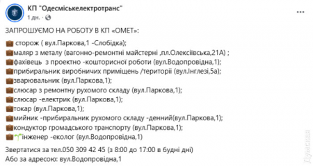 Досить цікаве оголошення з’явилося у соцмережах КП «Одесміськелектротранс» у якому йдеться про пошук низки працівників. Зі списку відкритих вакансій видно, що підприємству бракує фахівців усіх рівнів: від слюсарів, токарів і зварювальників до інженерів-екологів, кондукторів та прибиральників рухомого складу.