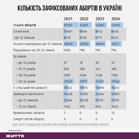 За 2021-2024 роках кількість абортів в Україні зменшилася на 21%, із різким падінням у 2022-му.