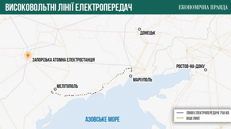 Первый- строительство ЛЭП длиной 201 км между подстанциями в оккупированных Мелитополе и Мариуполе. Эта линия является частью планов Российской Федерации по присоединению энергосистемы временно оккупированных территорий к своей сети.