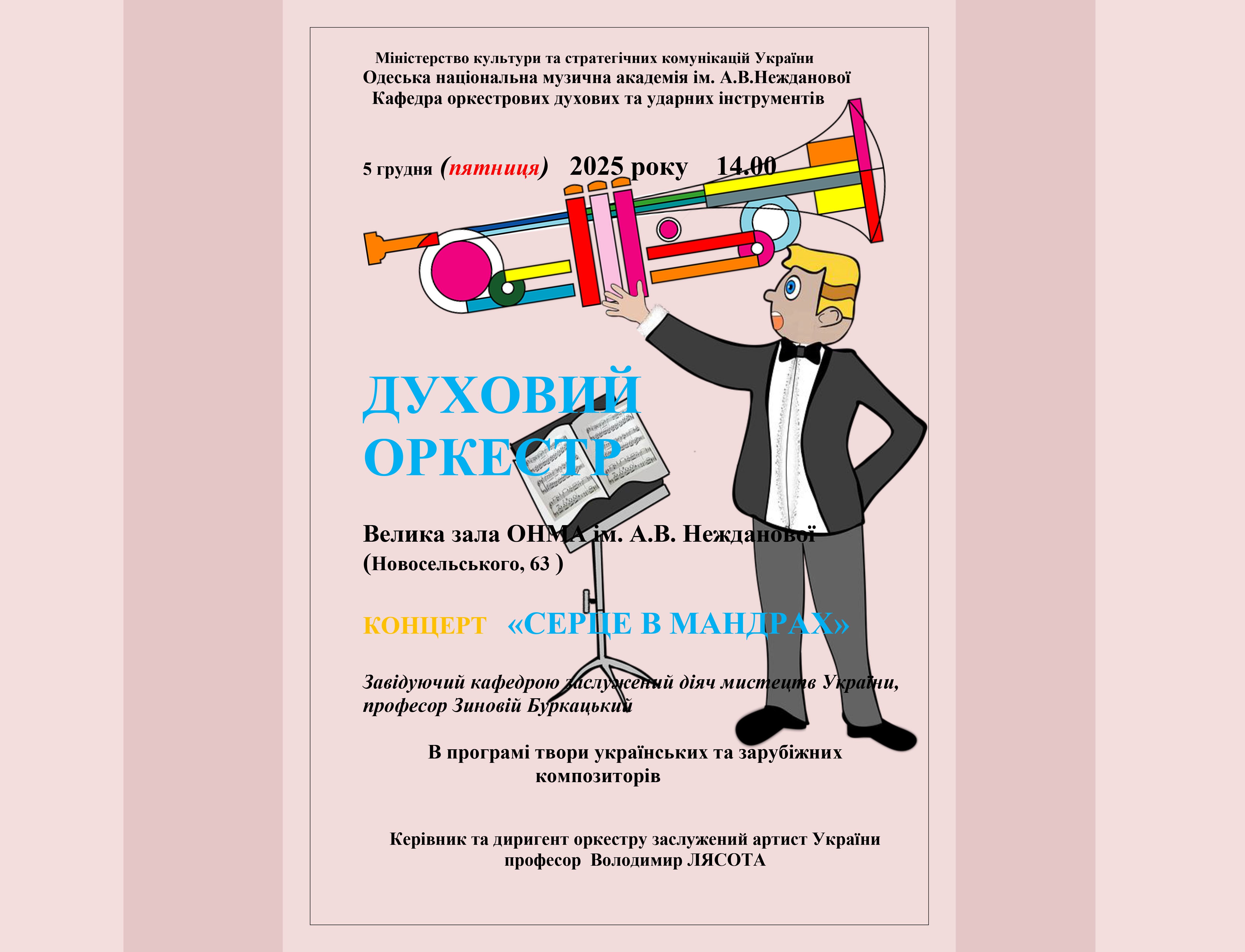 Одеса запрошує на справжню музичну подорож! У великій залі Музичної академії прозвучить яскрава концертна програма духового оркестру «Серце в мандрах» під керівництвом заслуженого артиста України, професораВолодимира Лясоти. Захід відбудеться за участі провідних викладачів, студентів та запрошених солістів — лауреатів міжнародних конкурсів.