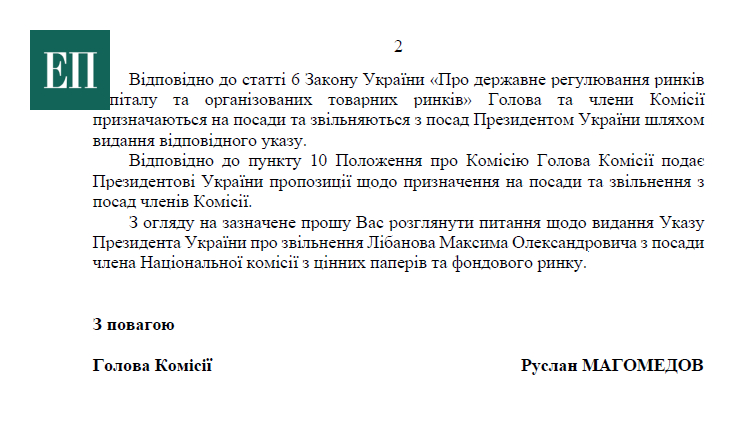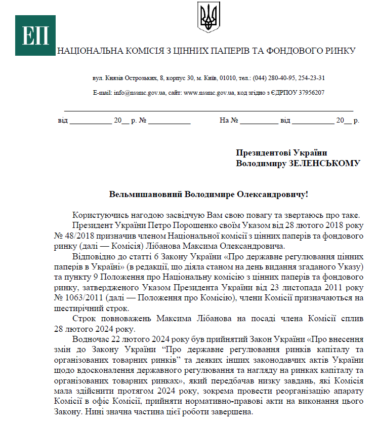 Але комісія втратить ще одного члена. Влітку Магомедов направив, на ім'я Зеленського лист (копія є в розпорядженні ЕП) в якому попросив того звільнити із займаної посади Максима Лібанова. Причиною цього є той факт, що строк повноважень Лібанова сплив 28 лютого 2024 року (за законом повноваження продовжуються до ухвалення відповідного рішення президентом).