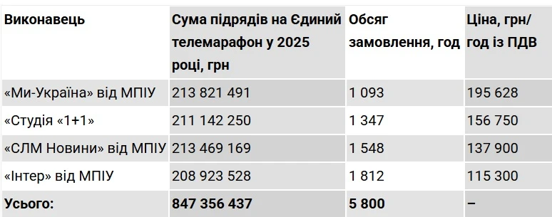 У березніповідомлялося, що ДП "Мультимедійна платформа іномовлення України" уклало чотири угоди з телеканалами на створення контенту для марафону "Єдині новини #UAразом" в 2025 році на суму 738 млн грн.