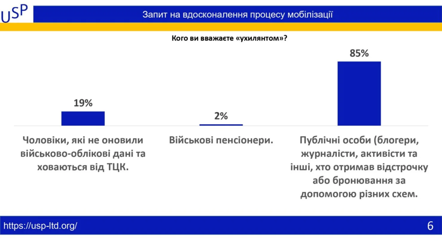 Переважна частина українського суспільства висловлює підтримку мобілізації, проте водночас очікує більш прозорих правил та суворішого контролю над тими, хто намагається уникнути служби. Найчастіше "ухилянтами" громадяни називають публічних людей — блогерів, журналістів та активістів, які отримали бронювання або відстрочку через різні схеми.
