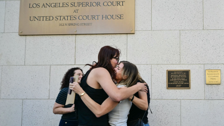 Батьки та родичі потерпілої обіймаються після того, як присяжні визнали Meta та YouTube винними у справі про залежність від соціальних мереж. Вищий суд Лос-Анджелеса 25 березня 2026 року